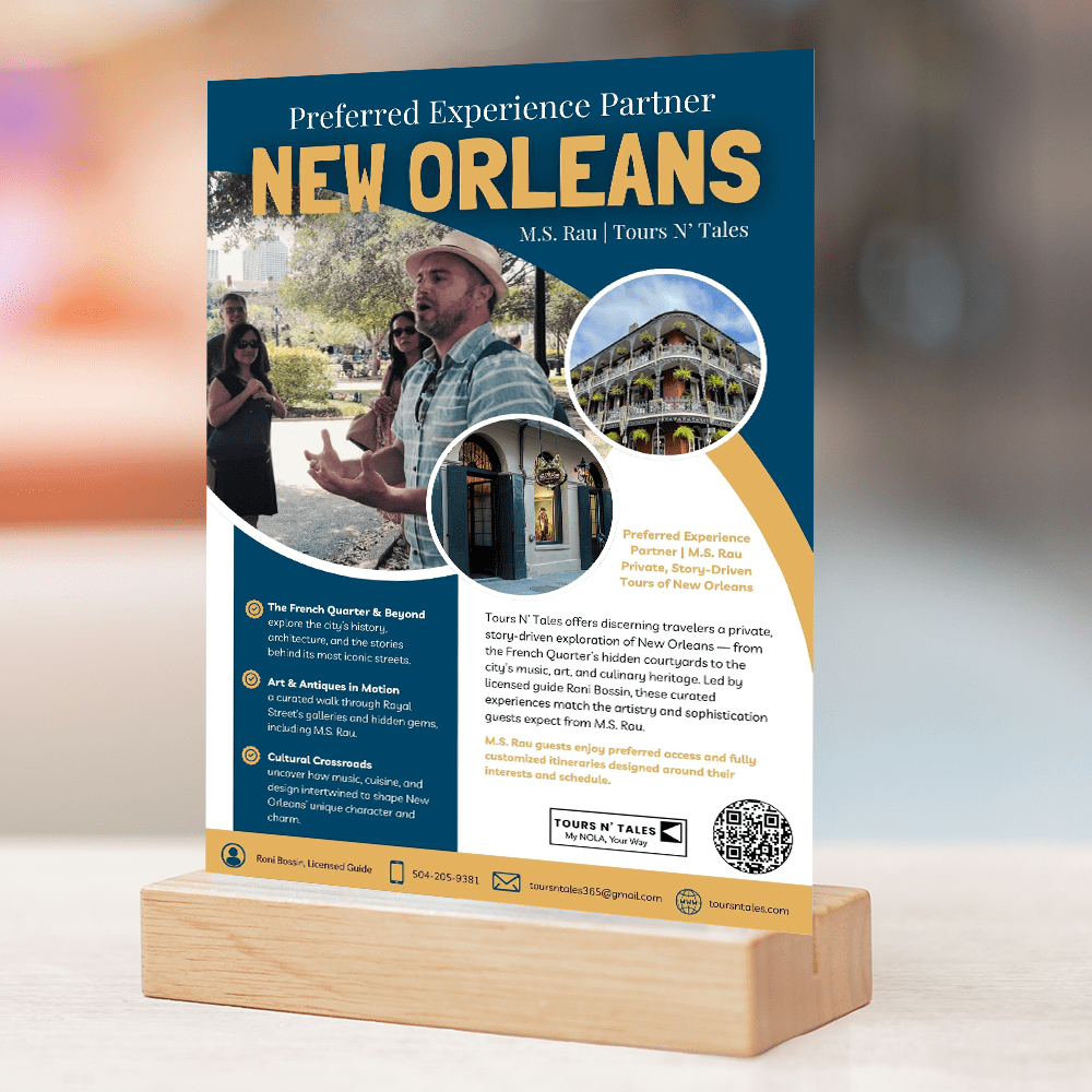Partner slip sheet flyer for Tours N’ Tales and M.S. Rau Antiques of New Orleans, LA.